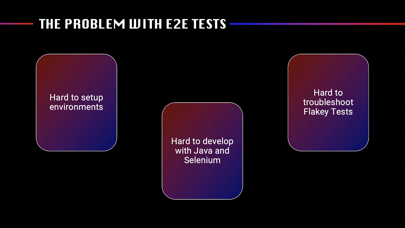 At SailPoint, end-to-end (E2E) tests were one of our biggest user interface (UI) workflow problems. We used Selenium for our E2E tests, which made it hard to develop and debug tests quickly. Selenium is a programming language that UI developers aren’t usually accustomed to. Secondly, and perhaps more importantly, using this tool to troubleshoot and visualize what is happening in the UI at each test step is a challenge.
