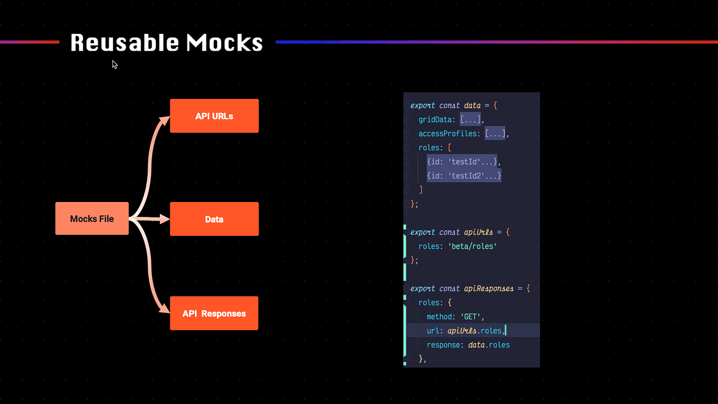 As mentioned before, we created an interceptor to mock API responses for stories. However, it is also helpful to organize those mocks so that they can be reused in Cypress tests and even in unit tests. Knowing that we’ve since been creating objects with the mocked data and placing them in a separate file. To inherently not keep it specific to either the story, the Cypress file, or even a specific story or test.