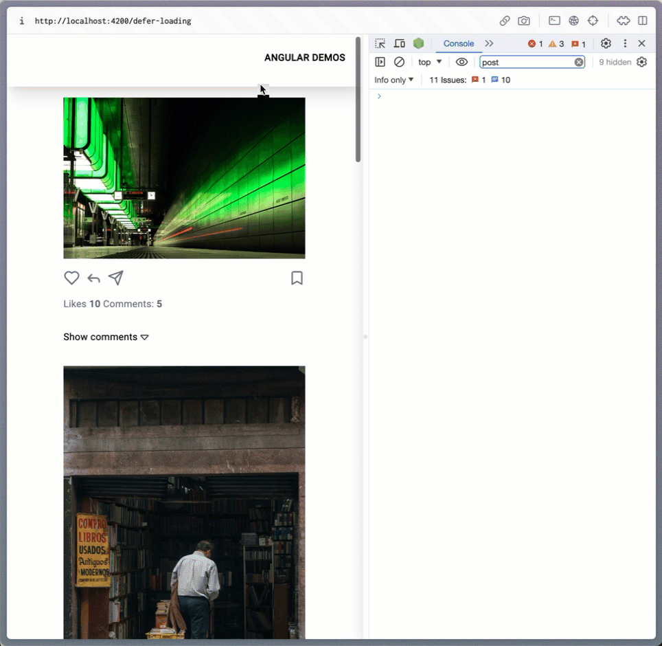 Here in the GIF below, you can see how theOnInit lifecycle for the post component gets called after scrolling down, and the component gets into the viewport.