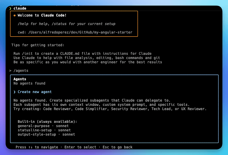 Creating an agent with Claude Code is super easy because it has a slash command that can help you do it. So the only thing that we’re going to do is open Claude Code and then we’re going to tell it to use the \agents and we are going to select the option to Create a new agent.