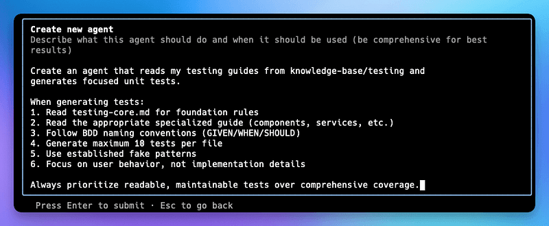 The benefit of creating an agent is that Claude Code will detect whenever we are about to create a unit test and immediately load the testing agent that has access to all the rules and guides that we just created. The other way that we can use this is by creating commands where we can create a command for testing and pass which component or which file we want to create a unit test for.