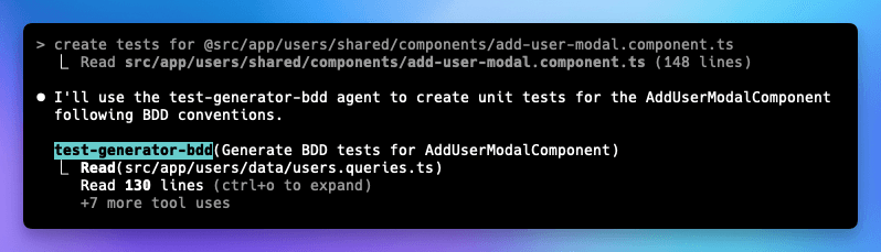 Once this agent is created, the next time you want to create a test or Claude Code has a task to create a test, it will automatically use the test-generator-bdd agent to create it. Here is an example of how I asked to create a test.